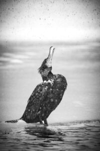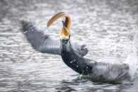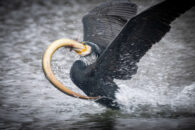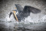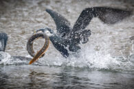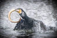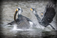 winterzeit ist in der tierfotografie immer „besonders“. die „haarigen“ schützen sich in einem prächtigen winterkleid gegen die kälte. die am wasser lebenden „gefiederten“ rücken an eisfreien plätzen zusammen. und dann kommt es auf engem raum auch schon mal zu einem heftigen gerangel um den beutefisch. in diesem fall muß sich der erfolgreiche jäger den zappelnden aal (ca. 60-90 cm lang) nicht nur in „schluckrichtung mit kopf voraus“ vorlegen. gleichzeitig muß er die beute gegen ca. 5 hungrige mitstreiter verteidigen. ich wiederhole mich: solche szenen kann man nicht „machen“. die bekommt man geschenkt! :-))) ich sage: „herzlichen dank“!
