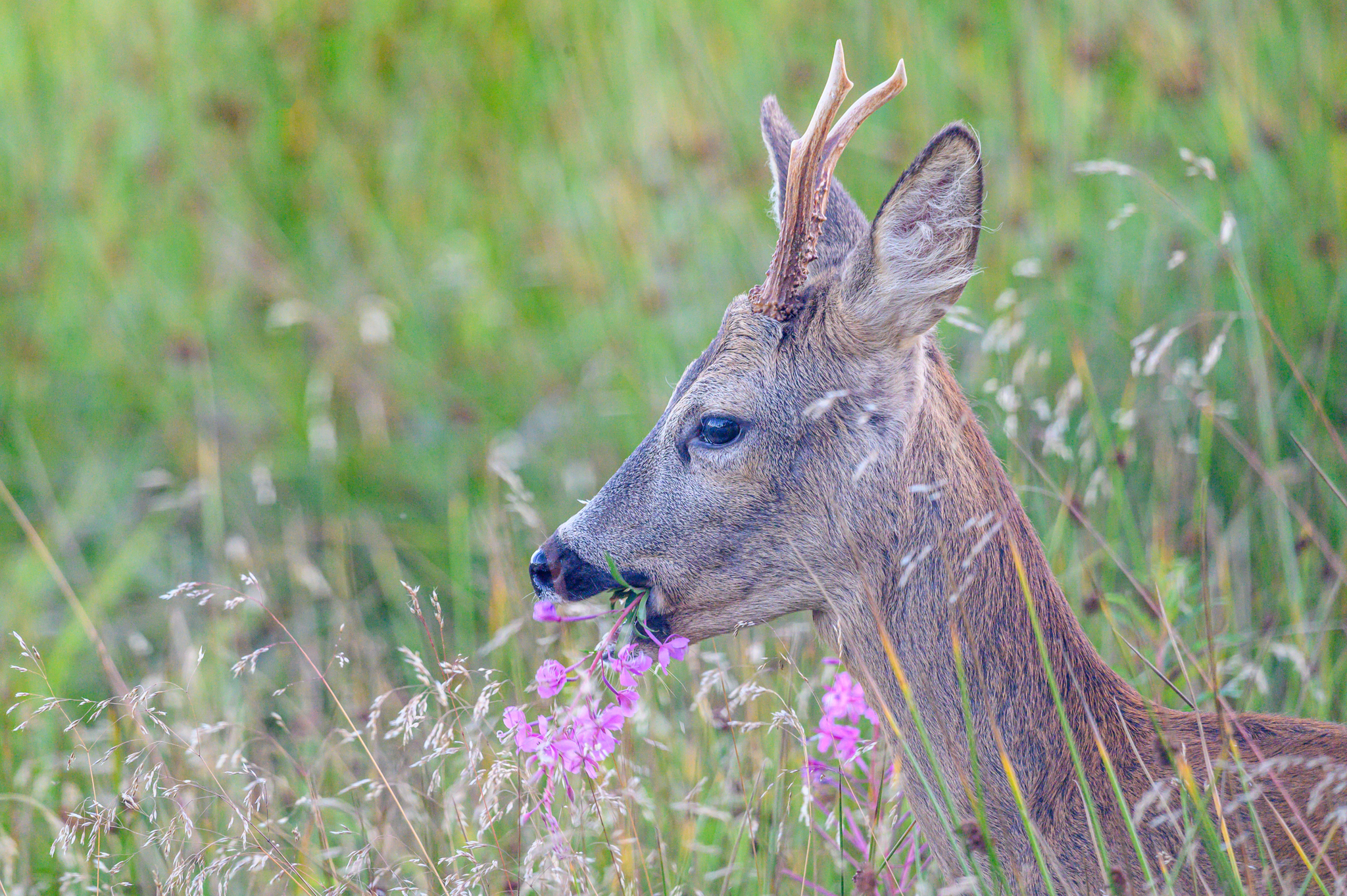 öfter hatte ich diesen jungen bock im anblick. er erschien mir sehr jugendlich und unbedarft. obwohl er ständig sicherte, stand er deutlich unter 10 meter vor mir. es schien einfach „alles zu passen“… :-). bei der nahrungsaufnahme ist das rotwild mehr ein „rasenmäher“. das prinzip ist: hauptsache viel…! das rehwild dagegen ist eher ein feinschmecker. es selektiert und holt sich hier mal ein leckerchen und dann wieder dort…am allerliebsten: WEIDENRÖSCHEN. ihre geschmacks- resp. nährstoffe scheinen unwiederstehlich zu sein.